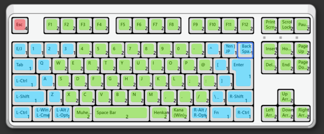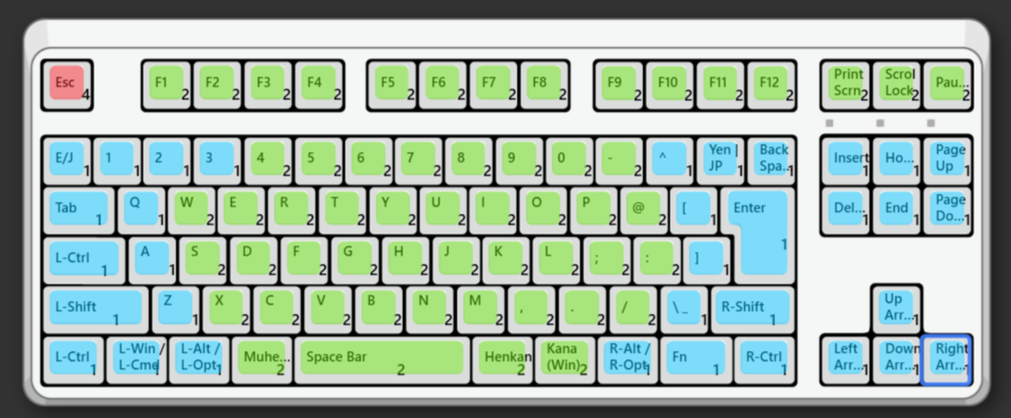変荷重モデルはほとんどのキーのキー荷重は45gで、小指で打つキーが30gになっていると公式サイトにありますが、具体的にはどのキーなのかというと下の画像の配列のようでした。